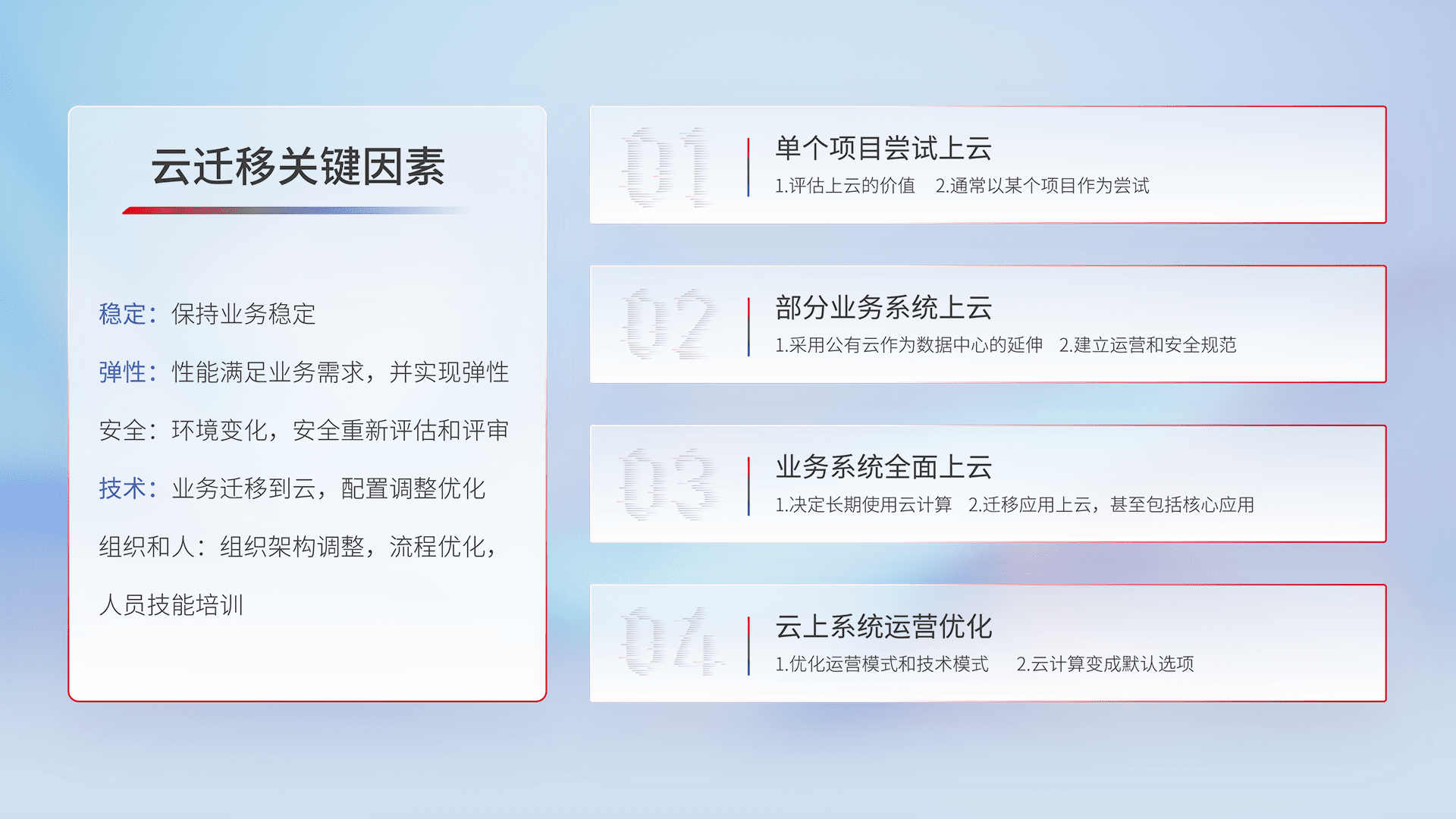 结合实际业务,,,从规划设计、、云平台选型、、、云原生改造、、、、数据迁移、、、、集成交付,,,迁移全过程为客户识别最佳上云路径,,做好风险识别管理,,设计网络架构、、身份权限、、、安全审计合规、、操作审计、、日志审计、、、监控告警策略、、多站点容灾设计等,,,,对云上基础设施进行整体规划,,提升IT治理水平,,,以满足弹性、、、、高可用、、高性能的需求。。。
